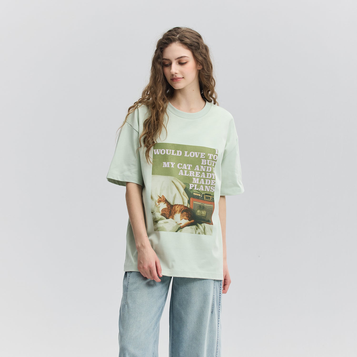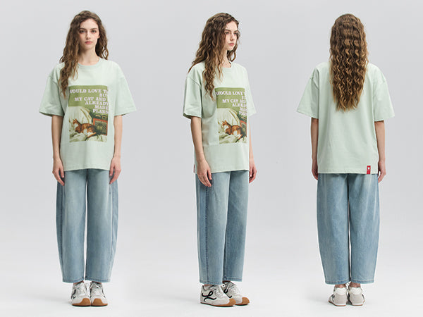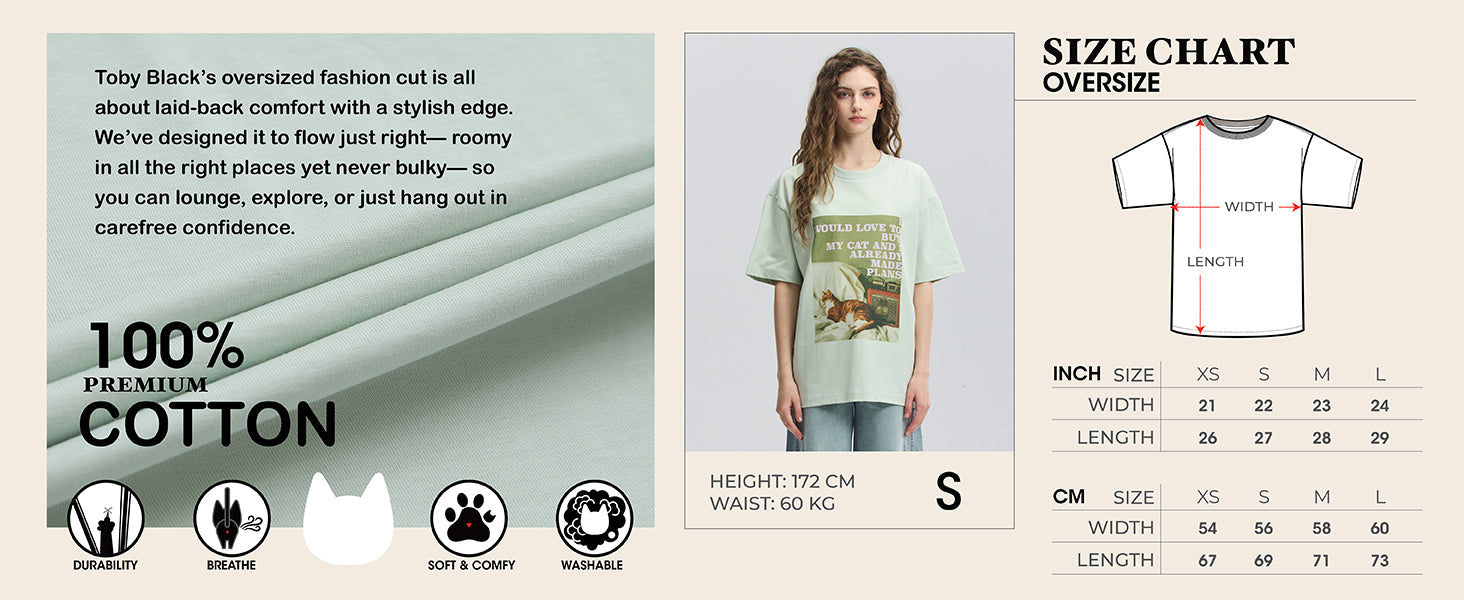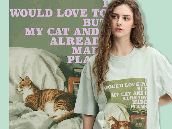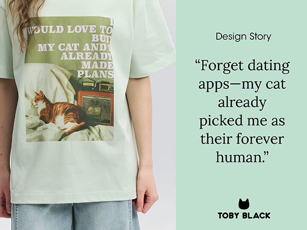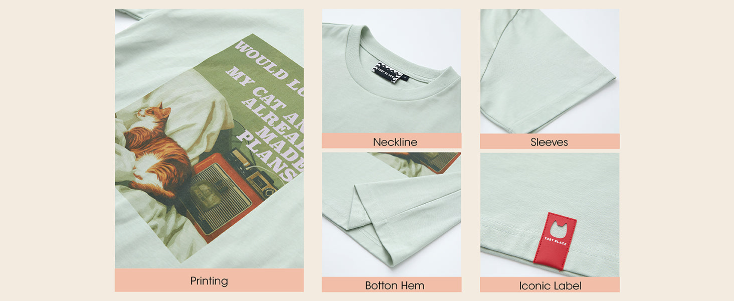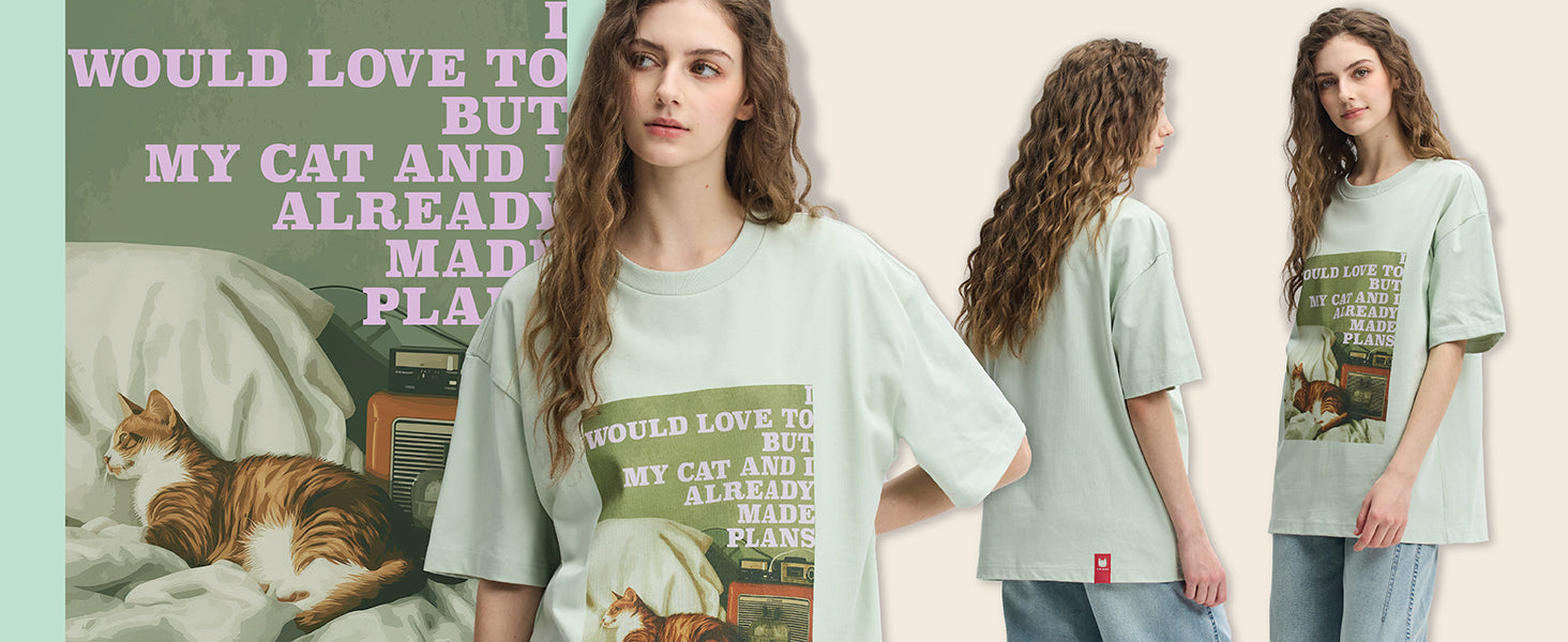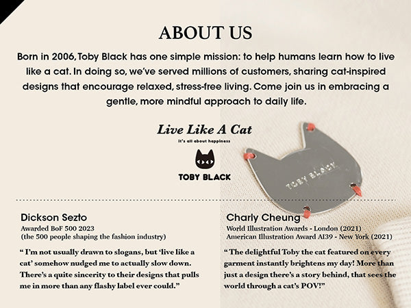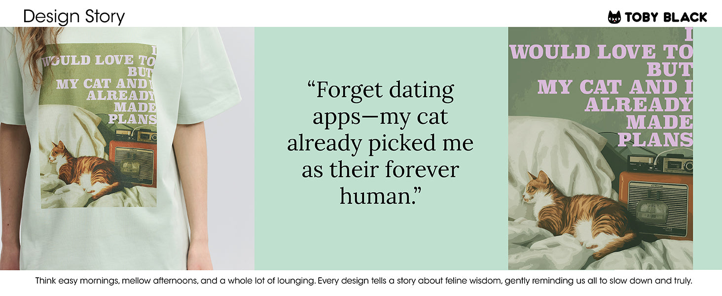 Each T shirt has a story behind, reminding us to live carefree, curious, and content, just like a cat.