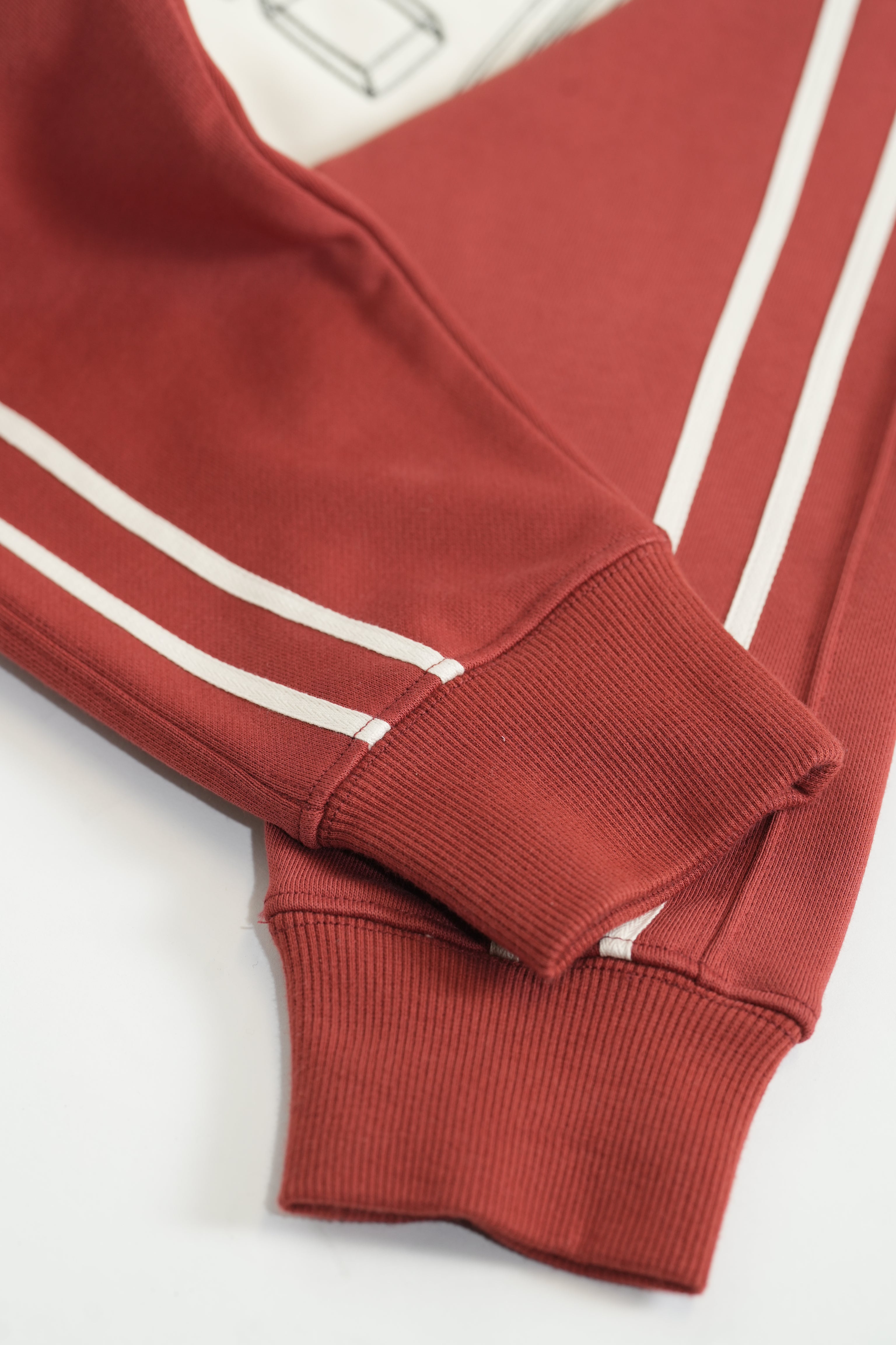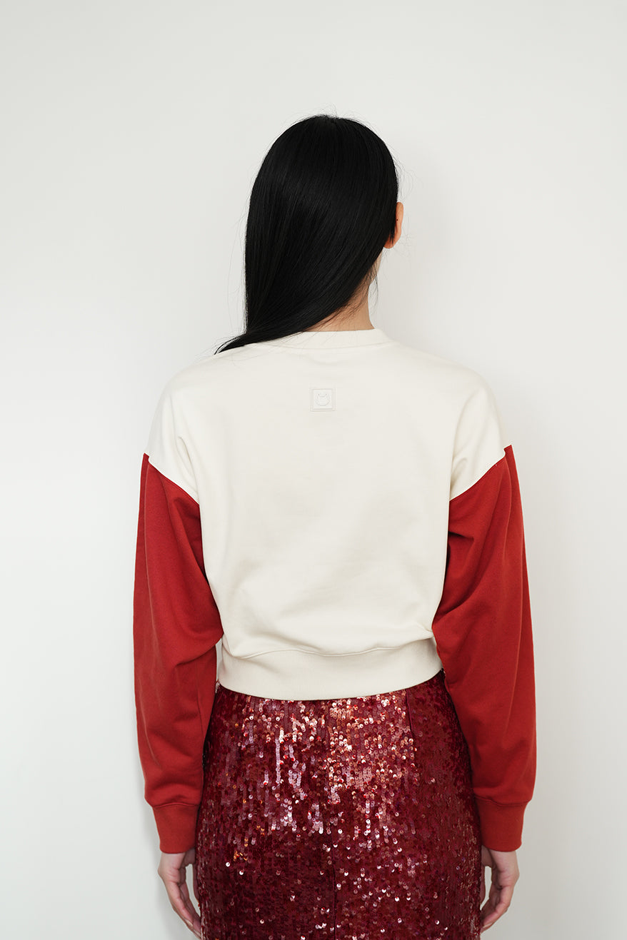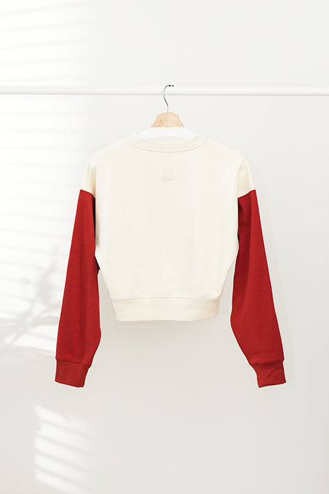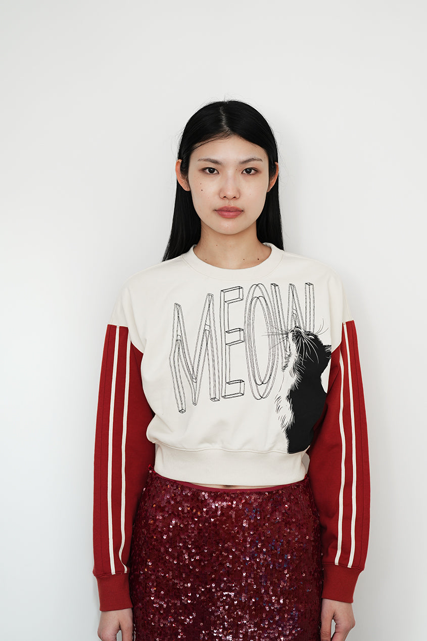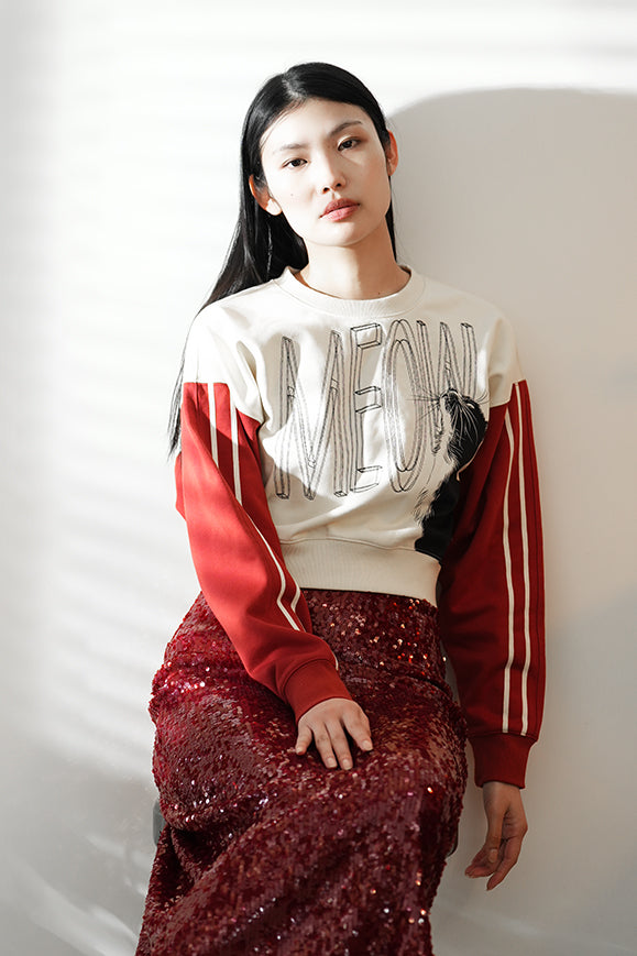 Make a bold statement with the Toby Black "MEOW" Cropped Sweatshirt. This eye-catching design features a striking black cat gazing up at the oversized "MEOW" text, creating a playful and dynamic composition. The contrast between the cream-colored body and the deep red sleeves with sporty white stripes adds a trendy, streetwear-inspired touch.