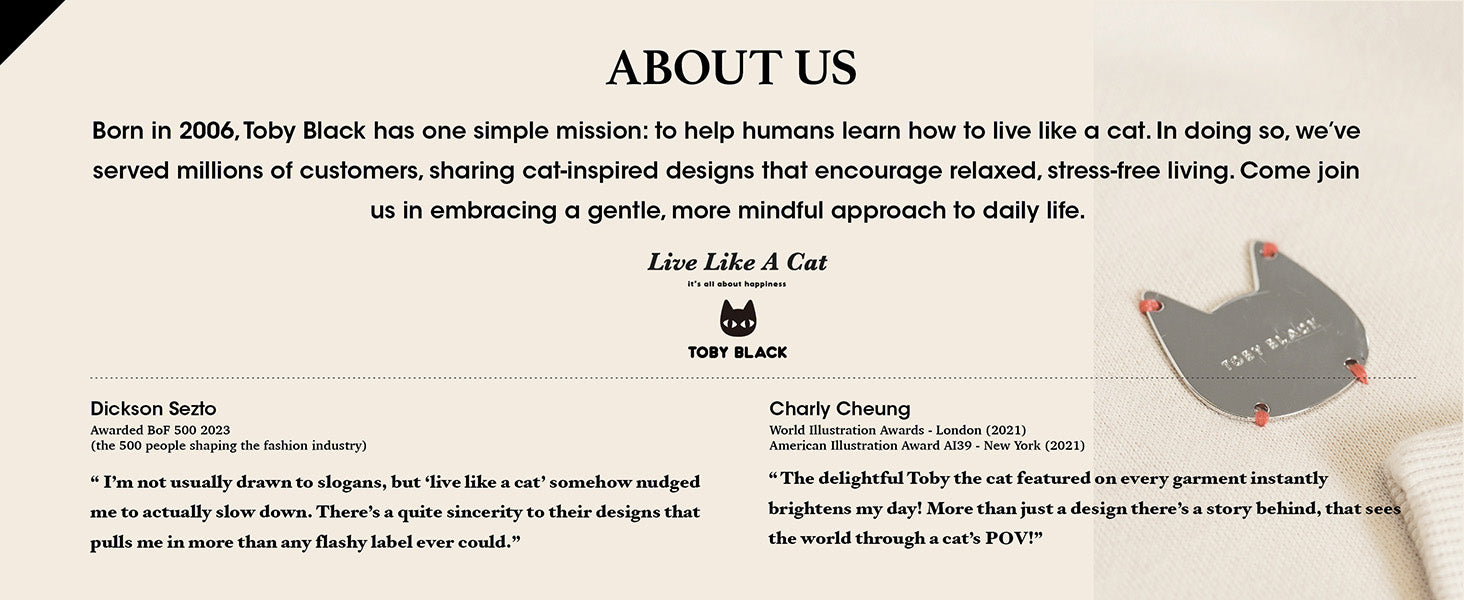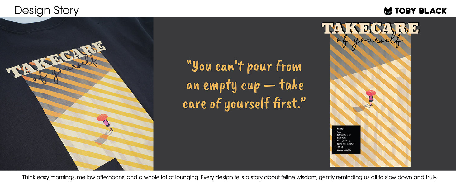 Each T shirt has a story behind, reminding us to live carefree, curious, and content, just like a cat.