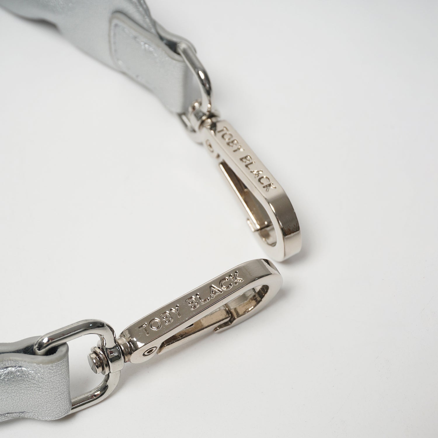 Silver engraved Toby Black metal clasps on silver leather strap close-up