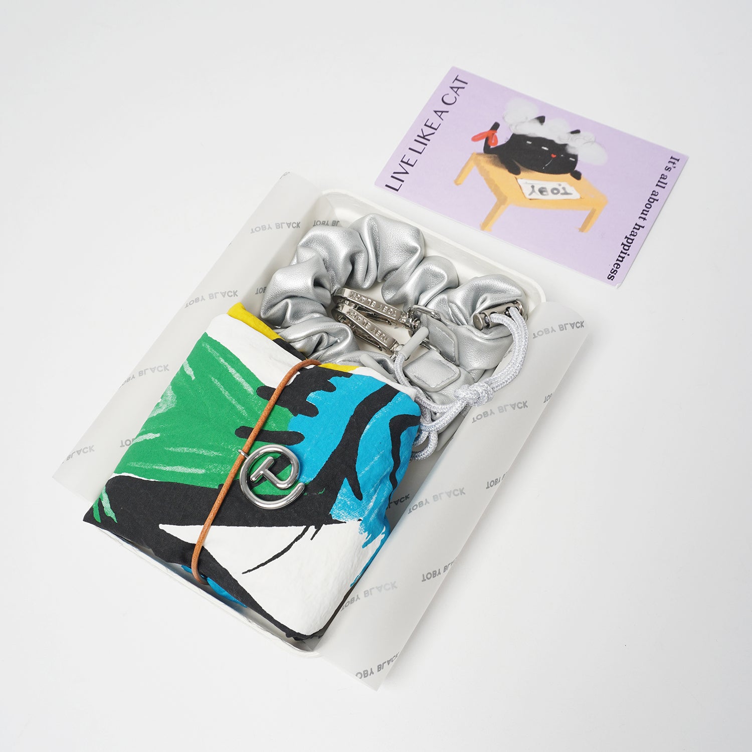 Toby Black Flower bag in white gift box with silver strap and Live Like A Cat car