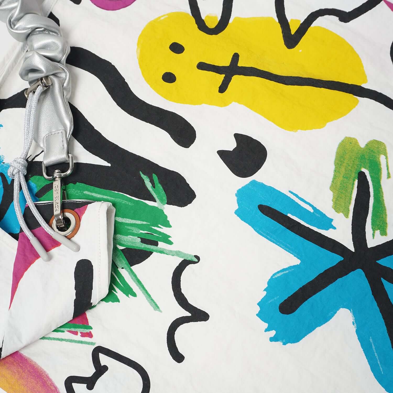 Toby Black Flower bag strap clasp with colorful abstract smiley face print close-up