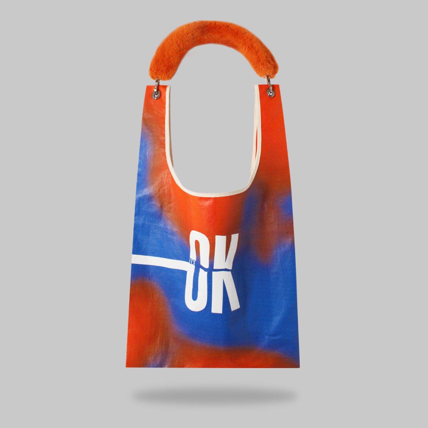 Close-up of orange fur strap with It's OK print detail